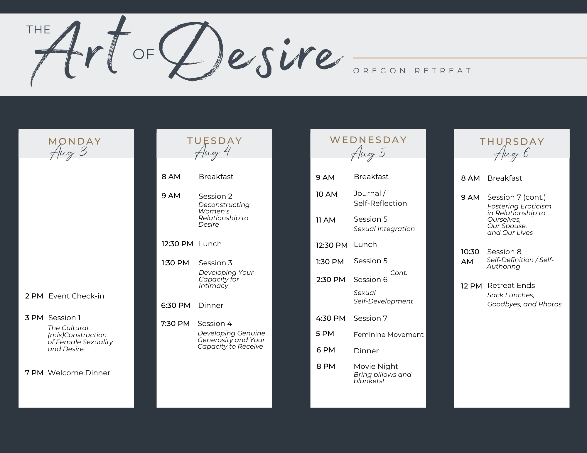 The Art of Desire Retreat will challenge these false traditions and offer you a new, life-expanding understanding of desire as well as its relationship to self-confidence and your ability to be at peace with your (God-given) sexuality.